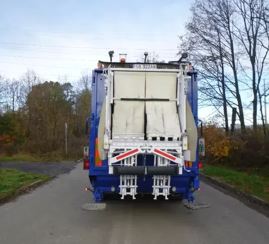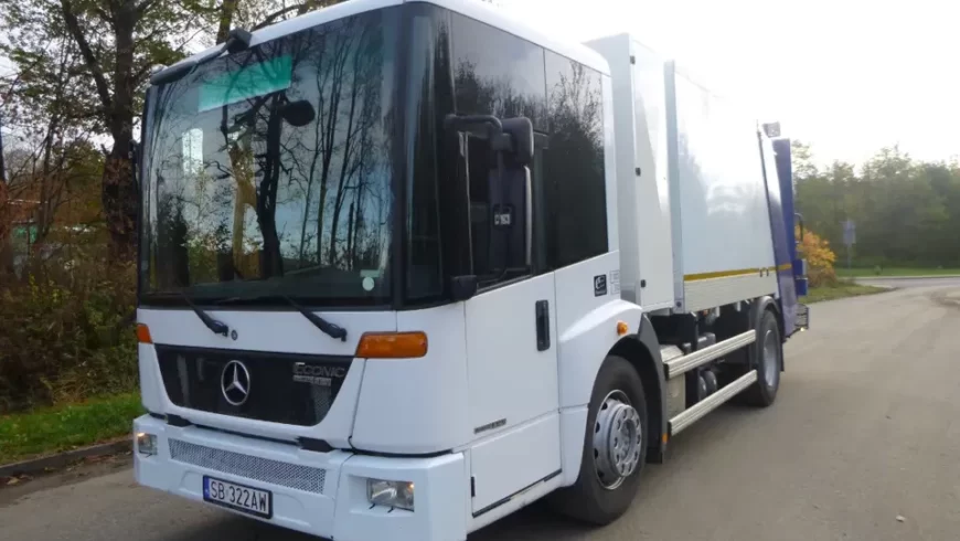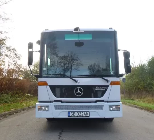 Śmieciarka jednokomorowa marki Mercedes-Benz Econic na SPRZEDAŻ lub WYNAJEM. Rok produkcji 2012, norma emisji spalin Euro 5, posiada zawieszenie pneumatyczne, hamulce tarczowe, automatyczną skrzynię biegów, zbiornik paliwa 300L. Pojazd wyposażony w ABS, ASR, PMS, tachograf, tempomat, klimatyzację oraz immobilizer z transponderem. Śmieciarka posiada kabinę trzymiejscową w której znajduje się pneumatyczny fotel kierowcy.